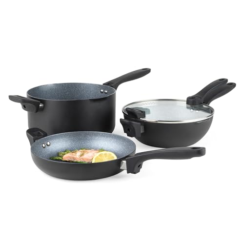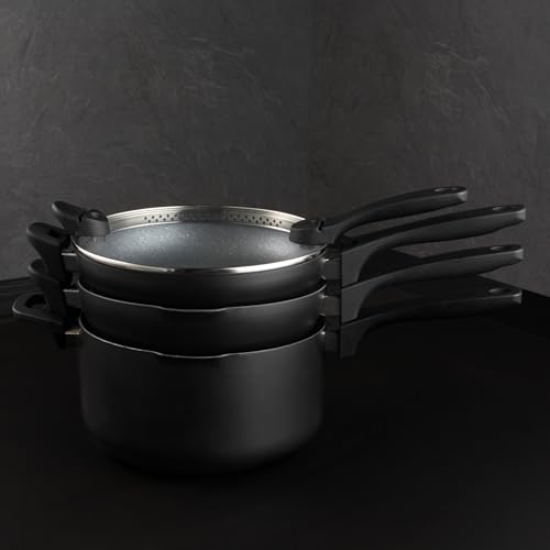 • Wonderfully designed, the pan set is suitable to be used on all hob types, including induction, and features a PFOA – free surface.
