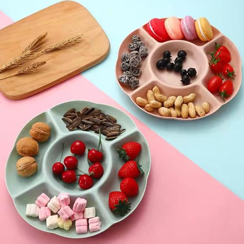 SacJkt Serving Platter, Snack Tray with 5 Compartments, Pack of 4 Serving Tray, Serving Platters for Parties, Plastic Snack Plate for Fruit, Candy, Nuts, Desserts (Pink+Green)
