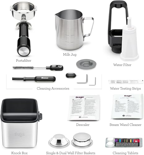 - INCLUDED ACCESSORIES: Mini Grinds Bin, 58mm Full Stainless Steel Portafilter, 1 and 2 cup Single Wall Filter Baskets, 480ml Stainless Steel Milk Jug, Steam Wand Spare Parts, Cleaning Kit, Water Hardness Test Strip, Water Filter Holder and Water Filter