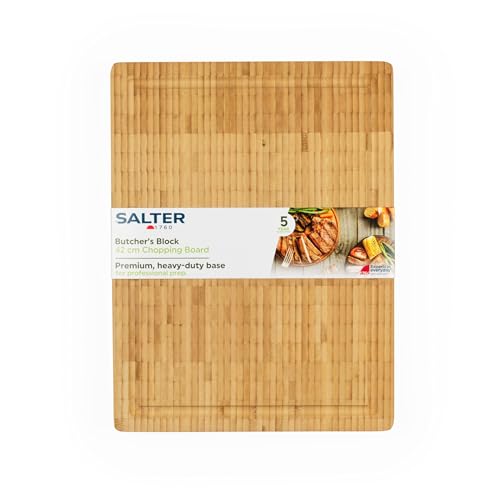- BUTCHERS BLOCK: Carve your meat joints like a pro! This Salter 42 cm Butchers Block protects your kitchen worktops while giving your home a classic, rustic look. It also has a groove around the outside to catch juices while your meat is resting.