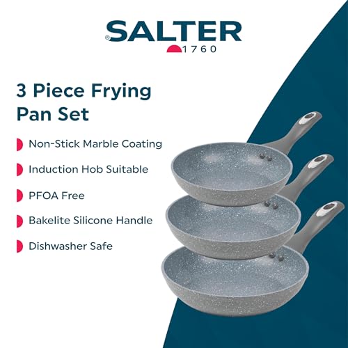 Salter COMBO-6441 3 Piece Non-Stick Frying Pan Set, 20/24/28cm, Bakelite Handle, Marble Collection, Induction Hob Suitable, Dishwasher Safe, PFOA Free, Use Little or No Oil, Forged Aluminium, Grey