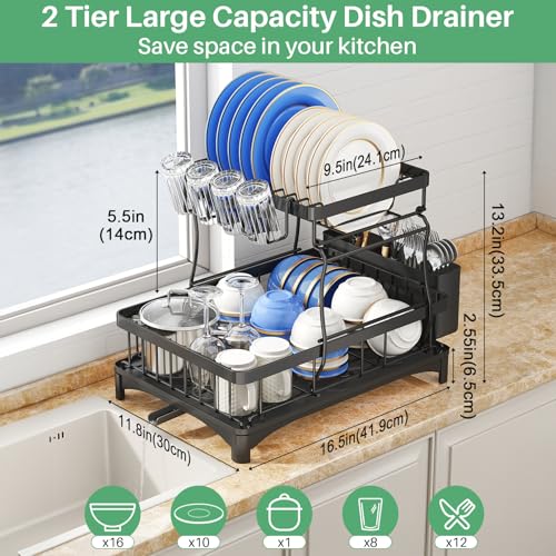 SAYZH Dish Drainer Rack, Detachable 2 Tier Dish Draining Rack and Drain board Set, Large Capacity Dish Drainer Organizer Shelf with Utensil Holder, Cup Rack for Kitchen Counter, Black