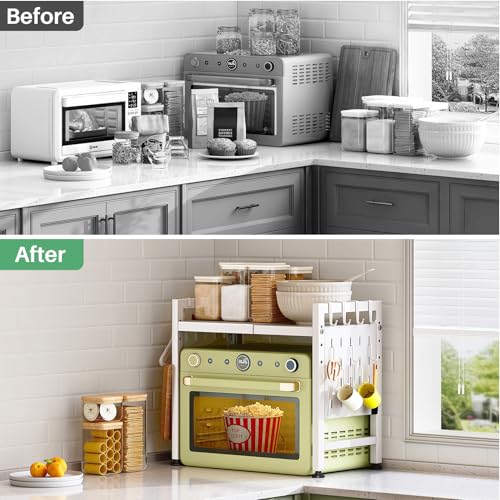 SAYZH Expandable Microwave Shelf, Microwave Stand with 10 Hooks/Cutting Board Holder/Rag rack, 2 Tier Microwave Oven Rack for Kitchen Counter Organizer, White
