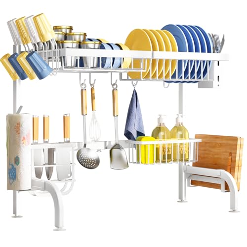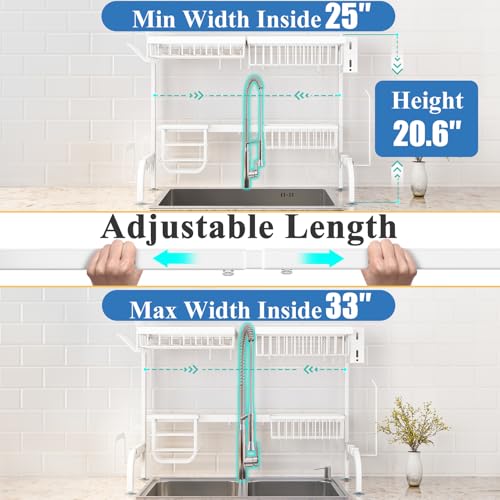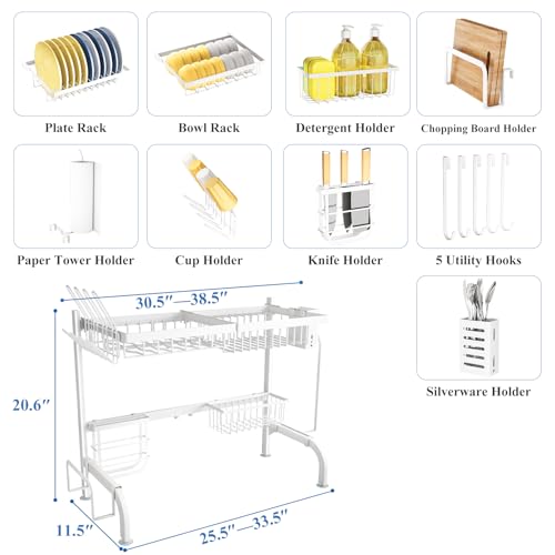 SAYZH Over The Sink Dish Drying Rack, Adjustable (25.5 to 33.5 inch) 2 Tier Metal Steel Dish Drying Racks for Kitchen Counter with Hooks Paper Towel Utensil Cup Holder Sink Caddy, White