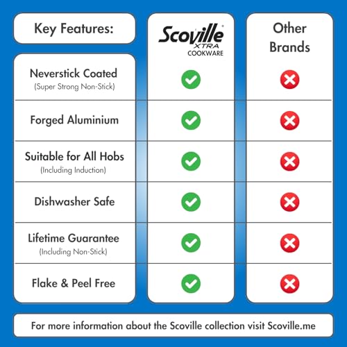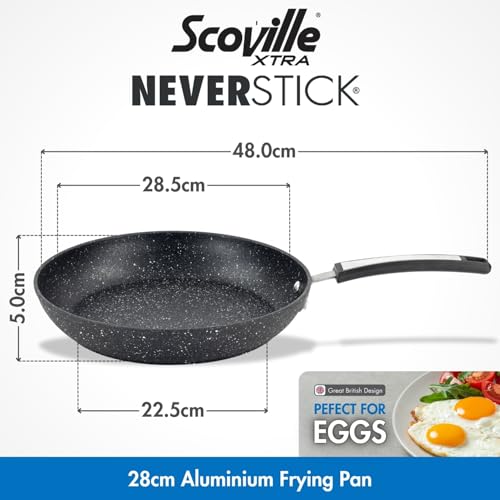 - EXCLUSIVE TO AMAZON: The Scoville Xtra 28cm Frying Pan is a game-changer for any home kitchen! Whether you're frying eggs, searing steaks, or crafting delicious omelettes, this pan does it all. Made from durable toughened aluminium, this pan delivers quick and efficient heat distribution for perfectly cooked meals every time.