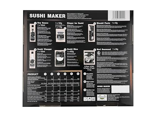 - 9-piece sushi set in the advantage pack – bamboo roll mat (1x), chopsticks (4x), sushi shaper (1x), nori seaweed leaves (28g), sushi rice (400g), sushi vinegar (150ml), soy sauce (150ml ), Wasabi (43g), Sushi Ginger (110g)