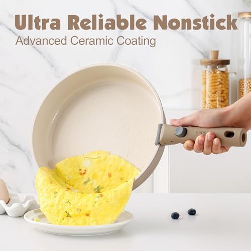 SENSARTE 17 Piece Ceramic Pots and Pans Set, Nonstick Detachable Handle Cookware, Induction Kitchen Cookware Set with Removable Handle (Almond Beige)