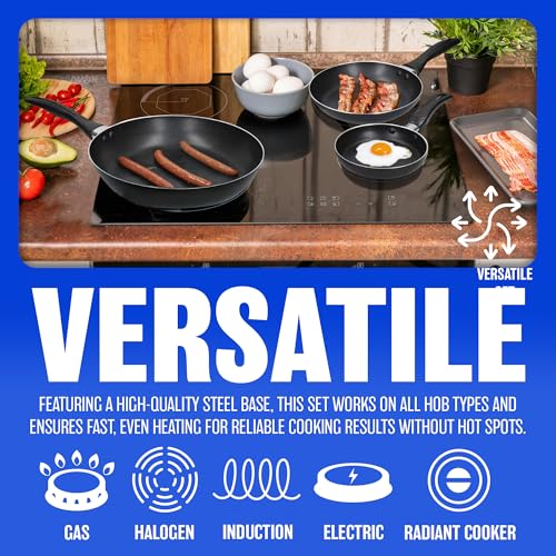 - ✔️ PREMIUM QUALITY – This frying pan set will fit in any kitchen as it can be used on all hobs and the high quality steel base will provide fast and even heating to avoid any hot spots