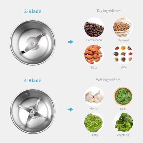 - 【2 Removable Stainless Steel Cups】: One grinder bowl with 2 blades for coffee beans, and other dry foods. And one chopper bowl with 4 blades for wet materials .You will be able to grind coffee beans, seeds, flax seeds, sesame seeds, spices, dried fruits, onions and garlic.
