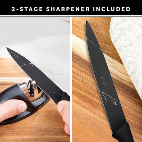 - Easy Maintenance with Two-Stage Knife Sharpener: The included sharpener maintains each blade in peak condition, featuring ceramic and carbon steel sharpeners for both fine and coarse adjustments.
