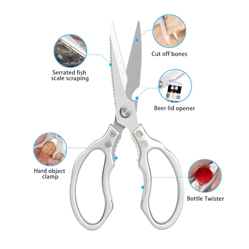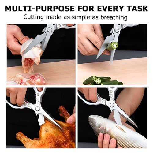 - Comfortable to Handle and Easy to Use: Thanks to the hardened stainless steel blades, these scissors effortlessly cut through a variety of materials such as cardboard, string, food, meat, vegetables, chicken, fish, herbs, seafood, and bags. Perfect for use as kitchen scissors, poultry shears, or multi-purpose household scissors.