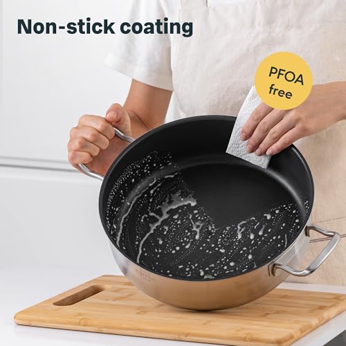 ✔ Elegant induction pan with durable coating Easy care, robust and rust proof stainless steel on the outside with an elegant satin finish, matt black Teflon coated on the inside for maximum durability. Free from PFOA