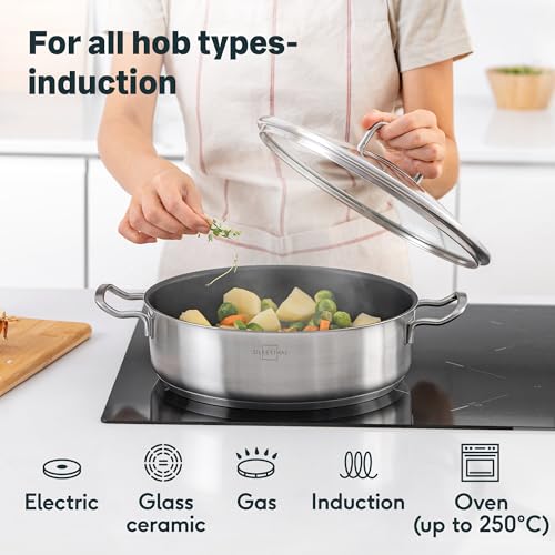 - ✔ Versatile and safe to use pan suitable for induction cookers, electric, gas, ceramic and glass ceramic cookers. Oven proof and heat resistant up to 25°C without a lid. Easy handling thanks to ergonomic and non slip handles