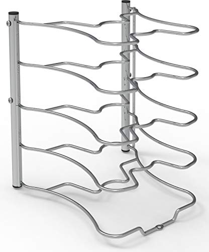 • Great pan organizer to save cabinet and countertop space, stores up to 5 pans