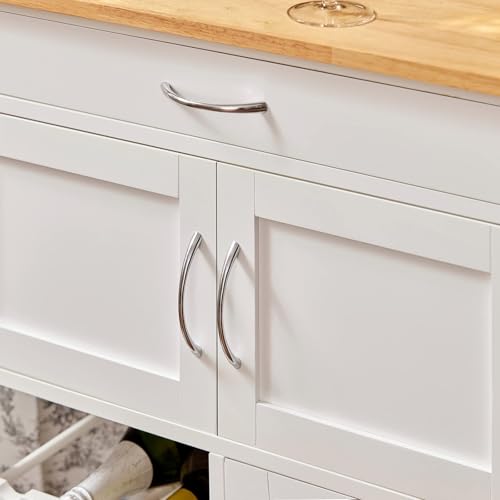 - [SMART MOBILE KITCHEN STORAGE]: This kitchen trolley on wheels is perfect for small spaces, offering a mobile kitchen island with a rubberwood top, cupboard, drawer, and wine rack – perfect for keeping your essentials stylishly organised in a compact kitchen setting