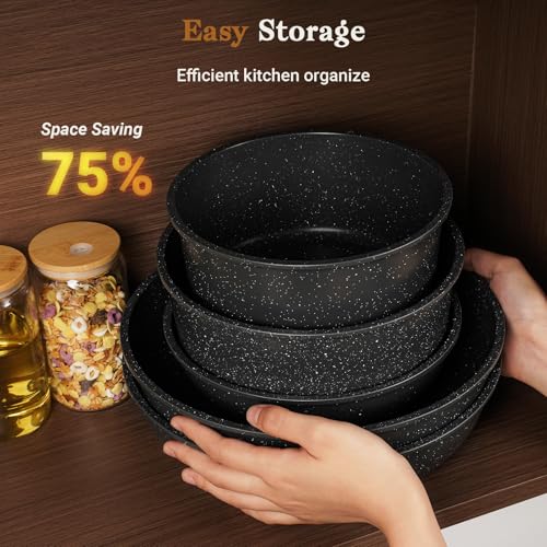 • Efficient Storage: Pots and pans set with detachable handles allow for compact nesting, optimizing 75% kitchen cabinet space and providing a healthy cooking environment,making for easy storage in cabinets or RVs
