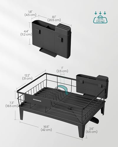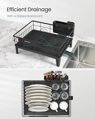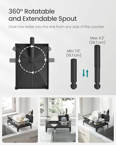 SONGMICS Dish Drying Rack, Dish Drainer for Kitchen Counter, 360° Rotatable and Extendable Spout, Drainboard, with Cutlery Holder, 31 x 42 x 18.5 cm, Ink Black KCS550B01