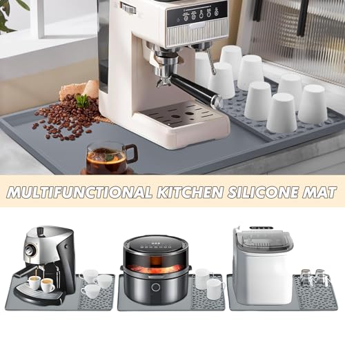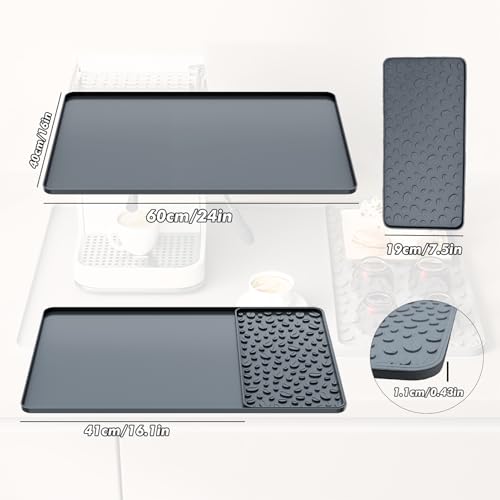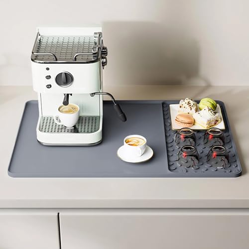 - 【Detachable Two-Part Design】This large 24''x16'' (60×40 cm) heat-resistant silicone coffee machine mat has a removable 15.7''x7.7'' (40×19.5 cm) extension with a coffee bean shaped raised design. The main mat provides a spacious, heat-resistant, shock-resistant space for a wide range of coffee machine sizes, while the extension can effectively dries coffee cups, carafes, filters and other coffee accessories. Both mats have raised edges to prevent spills or coffee spills and maintaining hygiene