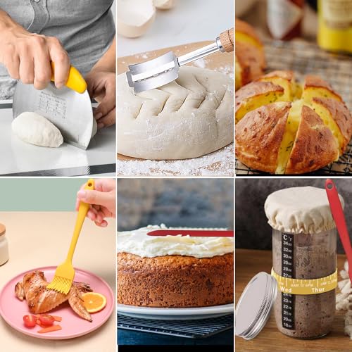 - 【Sourdough Bread Baking Supplies】:Package included :34oz Glass Jar, 11" Silicone Spatula, 9" Silicone Proofing Basket (Round), 10" Silicone Proofing Basket (Oval), Feeding Time & Level Tracker, Thermometer Band, Breathable Cloth Cover, Bread Trimming Knife with 5 Replaceable Blades, Metal Scraper, Silicone Brush. (There is an instruction that will guide you on how to feed Sourdough starter and baking.)