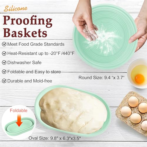 - 【Durable Bread Proofing Basket 】:9" Round and 10" Oval Proofing Baskets are made of BPA-Free food grade silicone which can withstand temperatures up to 446°F. food grade materials can be used to put fruits and vegetables.Not easy to deform, heat resistant, can be put directly in the oven or microwave, bake the bread for a better shape!. Tips:Before putting the dough into silicone basket, please sprinkle a thin layer of flour on the basket to ensure less sticking issues.