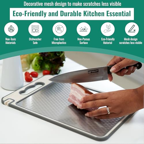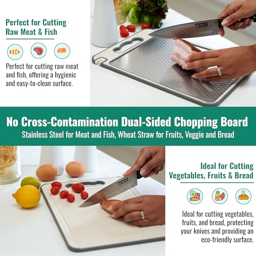 SUPERIOR QUALITY 4-IN-1 CUTTING BOARD This versatile cooking board features 304 stainless steel for meats and seafood, while the thickened, high-density wheat straw fiber side is perfect for fruits and veggies , ensuring antibacterial protection and preventing flavor transfer.
