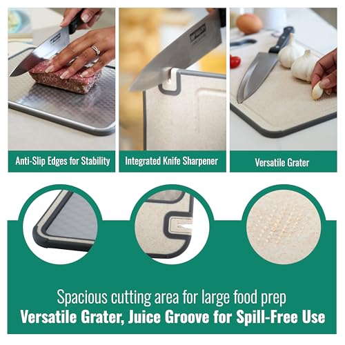 - MORE THAN JUST A CUTTING BOARD This all-in-one cooking essential includes a built-in knife sharpener and grater, saving you time in meal prep. Perfect for slicing, dicing, and even grating garlic or ginger, all in one high-density, antibacterial board!