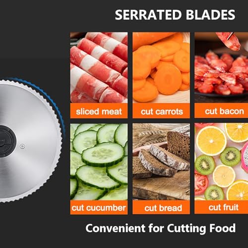 - 【2 STAINLESS STEEL BLADES】This slicer is made of stainless steel, you can use it to cut food at will. It is both economical and convenient to cut meat at home. The bottom suction cup can effectively improve the stability. The serrated blades are suitable for cutting foods such as meat slices, bread, vegetables, cheese, ham, etc.