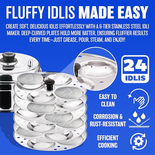 - EASY TO USE – The softer and fluffier the idli, the tastier it is! This idli maker set comes with a 4-tier idli rack/stand, where each plate can make up to 6 idlis. Each plate has a deep curved structured so it can hold a greater quantity of batter and even fluff up. All you need to do is grease the plates, pour in the batter and place in the idli cooking pot!
