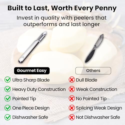 - DURABLE & EASY TO CLEAN – Built for heavy-duty daily use, this stainless steel peeler resists bending or breaking under pressure. Its smooth surface rinses clean in seconds or can go straight into the dishwasher for effortless cleanup.