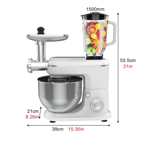 This versatile stand mixer comes with a meat grinder and a 1.5L glass juice blender, allowing you to effortlessly prepare a variety of dishes at home, from bread and cakes to cookies, juices, sausages, and more.