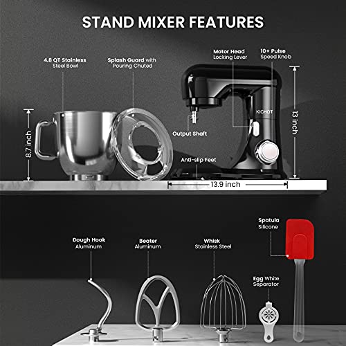 Stand Mixer, KICHOT 10+P Speed 4.8 Qt. Household Stand Mixers, Tilt-Head Dough Mxier with Dough Hook, Beater, Wire Whisk & Splash Guard Attachments for Baking, Cake, Cookie, Kneading, SM-1533