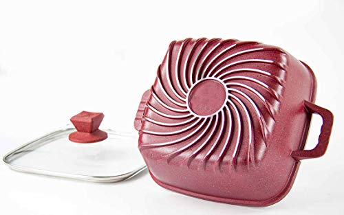 • Unique Vortex Base Technology Premium Die-Cast Aluminium BodyMolded Side Handles.Durable Marble Effect Non-Stick Coating Sturdy Tempered Glass Lids with Steam Vent