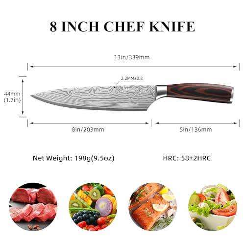 Sunnecko Chef Knife 8 inch, Kitchen Knives with Sharp High Carbon Stainless Steel Blade Professional Chefs Knives, Pakkawood Handle Knife for Kitchen with Shealth