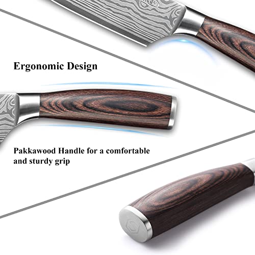 - Ergonomically Wooden Handle Chefs Knife: The blade of this chef knife is integrated with a soft Pakkawood anti-slip handle, ensuring comfortable grip for any hand sizes. Ergonomic design and well balance between weight and size of the knife greatly reduces wrist tension. Achieve the best cut without tiring our hand or wrist.