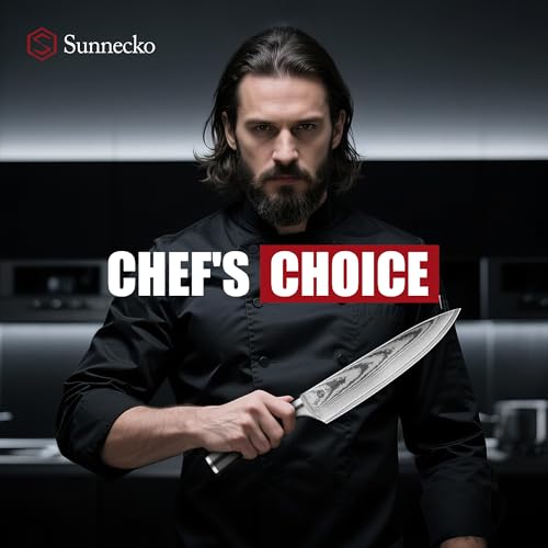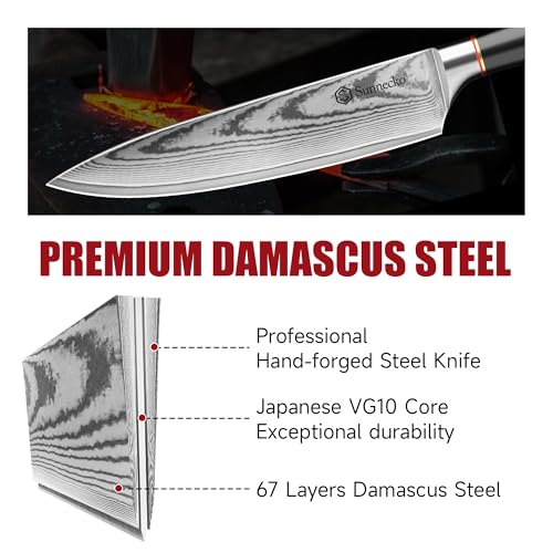 - 67-Layer Damascus Steel:Sunnecko Damascus Knife Set is made of Premier Japanese Steel VG10 Knife Core with 62 HRC high hardness.It's Real Damascus Knives with newest and most advanced forging technique.You will receive a professional and extremely sharp Kitchen Knives Set!
