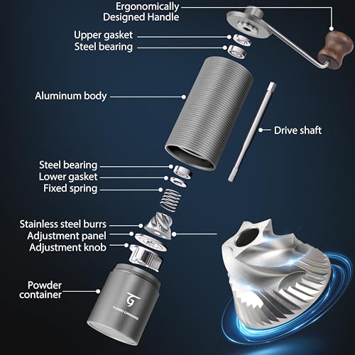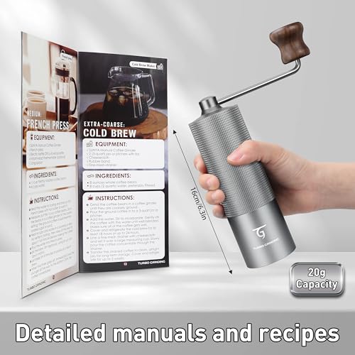 SUNYA Manual Coffee Grinder with Stainless Steel Conical Burr. Aluminum Shell Hand Coffee Bean Mill with Adjustable Settings. Coffee Recipes Booklet Included