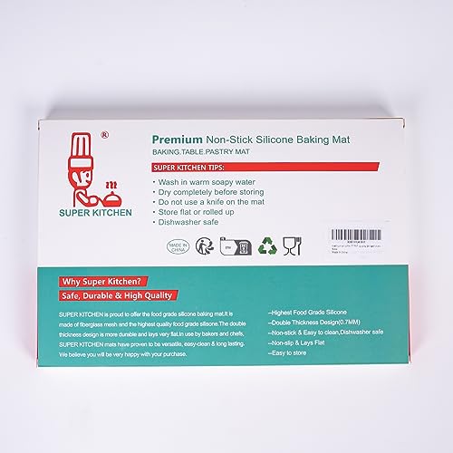 - [ DOUBLE THICKNESS, DURABLE and LASTING ] It is 0.7MM thickness and almost two times thicker than most PASTRY mats which is only 0.4MM. The 0.4MM mat is too thin and soft. SUPER KITCHEN mat is thicker and durable, so it doesn' t crinkle and move as you knead the dough.