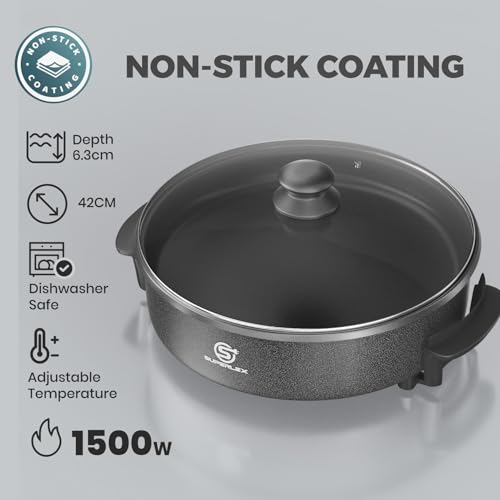 SUPERLEX Electric Frying Pan 42cm Multi Cooker 1500W Non Stick Cooking Pot with Tempered Glass Lid Adjustable Temperature Control Cool Touch Handle Durable Steel Base Easy Clean Electric Wok