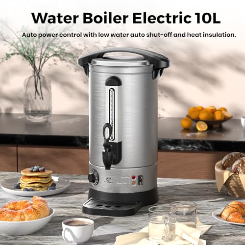 - Large Capactiy, Safety Design: the 10 liter hot water boiler provides customers, guests and staff with hot drinks quickly and effortlessly when they need it, without any mess. The water urn is made from high quality stainless steel in a sleek, simple design and is great for any home or commercial kitchen. The design includes handy water level gauge, carry handle, anti-drip tap, concealed element and locking twist lid.