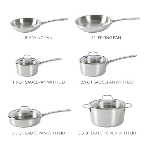 Sur La Table Kitchen Essentials Chef's Deck 10 Piece Stainless Steel Non Toxic Pots and Pans Kitchen Cookware Set w/Triply Encapsulated Base – Induction Safe