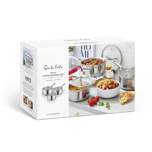Sur La Table Tri-Ply 3 Piece Saucepan Set with Tempered Glass Lids, Satin Interior Finish, 16cm/18cm/20cm Saucepans, Induction Compatible, Stainless Steel, SLT900234