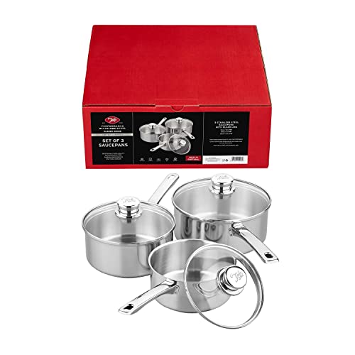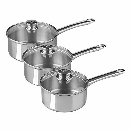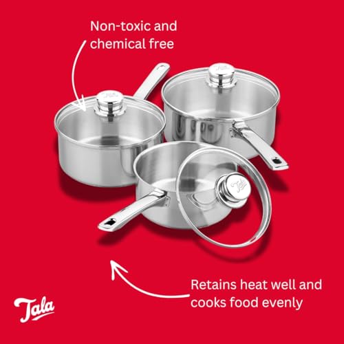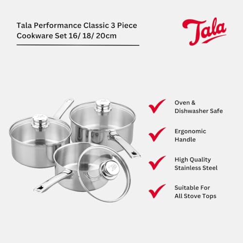 Tala Performance 3 Piece Stainless Steel Cookware Set, Saucepans with Glass lids, 16, 18 20cm. Made in Portugal, Guarantee, Suitable for All hob Types Including Induction Polished Mirror Shine Finish