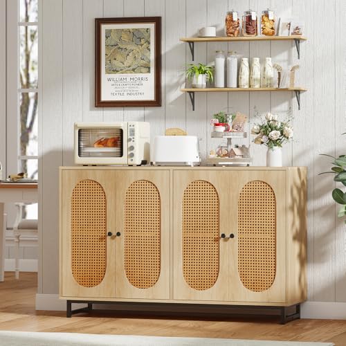 TANGZON Storage Cabinet, Rattan Buffet Sideboard with 2/4 Doors, 1/2 Adjustable Shelves & Metal Legs, Wooden Kitchen Cupboard Unit for Dining Living Room Hallway (4 Doors, 126x40x81cm, Natural)