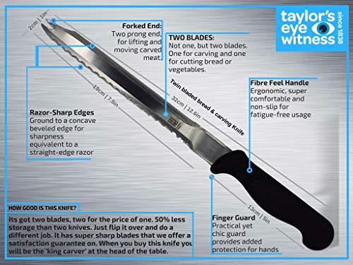 Taylors Eye Witness Sheffield Made Bread & Roast Carving Knife – 19cm Double Edged Blade with Serving Prongs. Multi Use Kitchen Knife with Fine Precision Ground Razor Blade Steel & Fibre Feel Handle