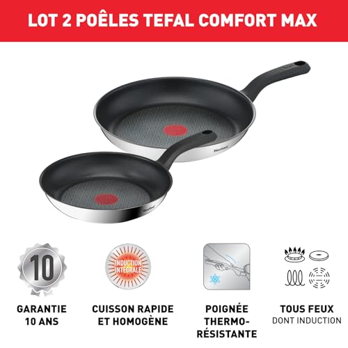 Tefal 2 Piece Comfort Max, 24cm & 28cm Frying Pans, Stainless Steel, Silver, Black & 26cm Comfort Max Stainless Steel Non-Stick Saute Pan and Lid, Silver