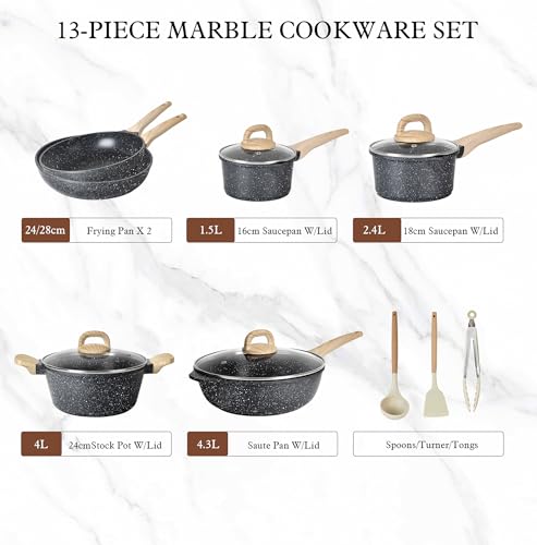 Terlulu Induction Pan Set with Lid 13-Piece Black Granite Cooking Pot Set, Non-Stick Pots and Pans Set without PTFE and PFOA