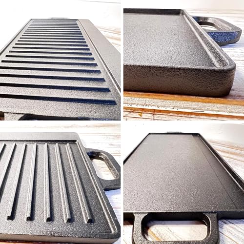 • 𝗣𝗥𝗢𝗗𝗨𝗖𝗧 𝗗𝗜𝗠𝗘𝗡𝗦𝗜𝗢𝗡𝗦 & 𝗗𝗨𝗔𝗟-𝗦𝗨𝗥𝗙𝗔𝗖𝗘 𝗗𝗘𝗦𝗜𝗚𝗡: Measuring 42cm in length, 23.5cm in width, and 1.5cm in thickness, this cast iron grill pan is designed with dual cooking surfaces. One smooth side is ideal for pancakes, while the ridged side provides perfect grill marks on meats and vegetables. This double-sided grill pan offers versatile cooking options for any meal, indoors or outdoors, making it a staple in any kitchen.