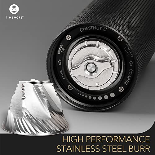 - PATENTED S2C CONICAL BURR: C3-pro grinder is equipped with Timemore patented S2C 660 stainless steel burrs adopted from the Chestnut X in a smaller 38mm size, its 6-axis high precision CNC cutting process is the guarantee of uniform powder, ensuring your coffee beans taste their best by consistently and swiftly ground.