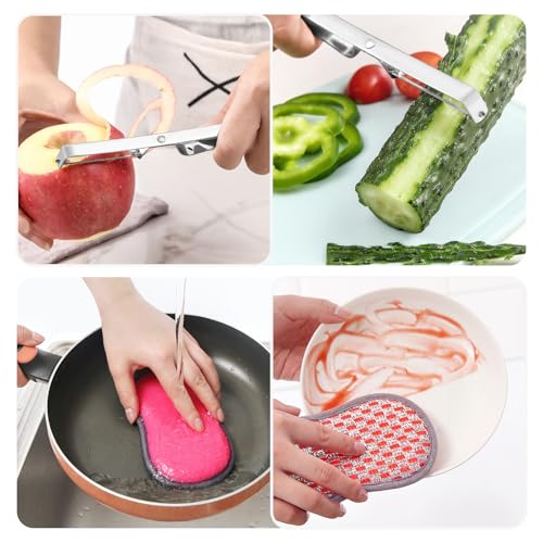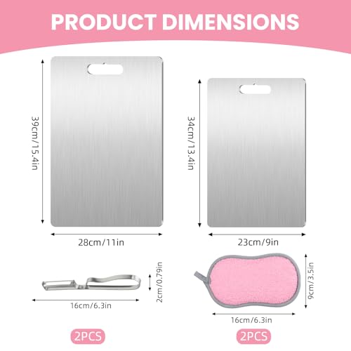 - 【Reliable Materials and Value Pack】- Our package including 2pack titanium cutting board size 39*28cm, 34*23cm with 2 pcs Kitchen Sponge and 2pcs Peeler .Constructed from sturdy stainless steel titanium alloy, our titanium chopping board is exceptionally durable, resists corrosion and rust, reusable, and offers a long-lasting service life.