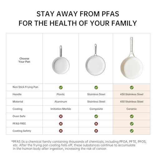 - SAFE & NON-TOXIC: Our ceramic non-stick frying pan is FREE from PTFE, PFOA, PFAS and other harmful chemicals, ensuring a healthier cooking experience. 280°C Safe for high-temperature cooking and safe for you and your family.